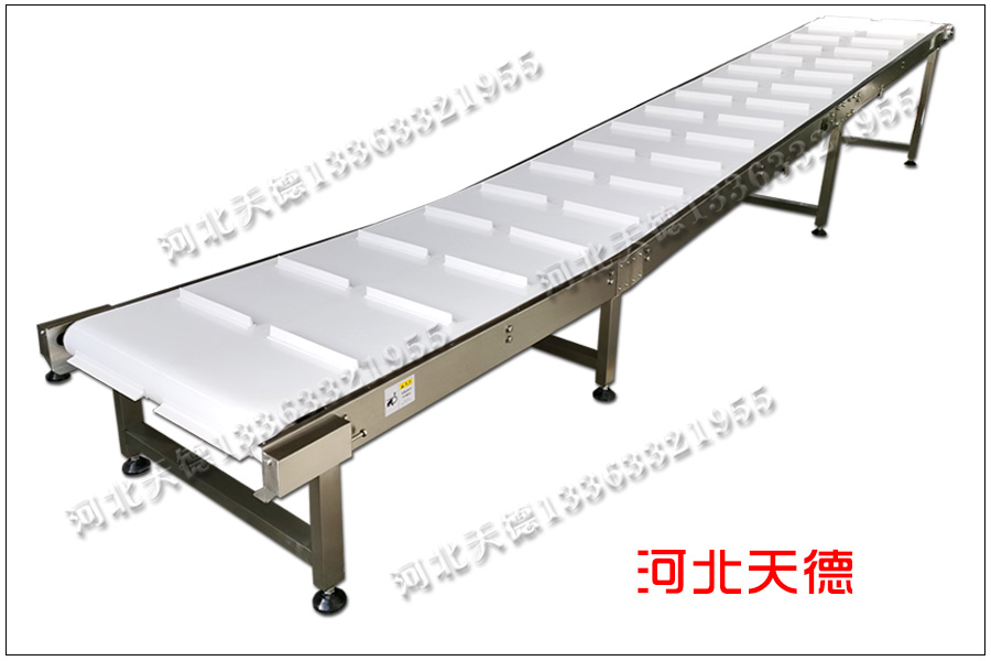 輸送帶采用白色橡膠輸送帶,橡膠輸送帶的厚度為1.5毫米,輸送帶的表面安裝高度為5公分的刮板提升。