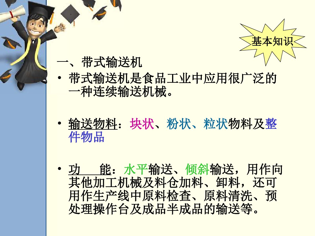 帶式輸送機(jī) 帶式輸送機(jī)是食品工業(yè)中應(yīng)用很廣泛的 一種連續(xù)輸送機(jī)械。