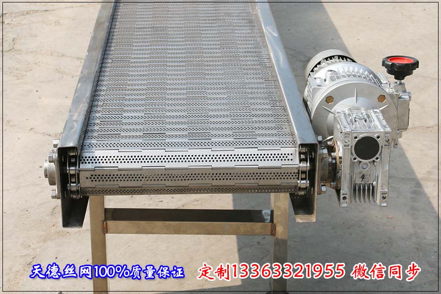 河北天德絲網(wǎng)制品有限公司生產(chǎn)音響家電鏈板輸送機、不銹鋼輸送機、扣板式輸送機、板式輸送機:13363321955