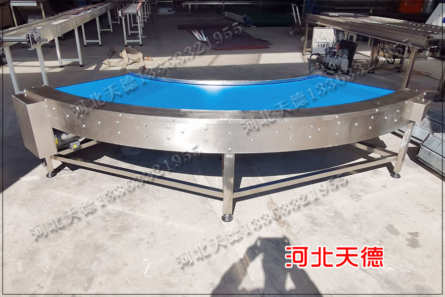 轉(zhuǎn)彎皮帶輸送機(jī)廣泛應(yīng)用在食品、飲料、電子等行業(yè),可以選用較小直徑的滾筒,使轉(zhuǎn)角連接方便,很好的解決過渡問題。