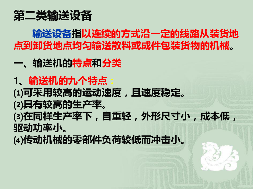 輸送設(shè)備 輸送設(shè)備指以連續(xù)的方式沿一定的線路從裝貨地點(diǎn)到卸貨地點(diǎn)均勻輸送散料或成件包裝貨物的機(jī)械。
