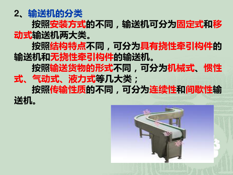 輸送機的分類 按照安裝方式的不同,輸送機可分為固定式和移動式輸送機兩大類。 按照結(jié)構(gòu)特點不同,可分為具有撓性牽引構(gòu)件的輸送機和無撓性牽引構(gòu)件的輸送機 按照輸送貨物的形式不同,可分為機械式、慣性式、氣動式、液力式等幾大類; 按照傳輸性質(zhì)的不同,可分為連續(xù)性和間歇性輸送機。