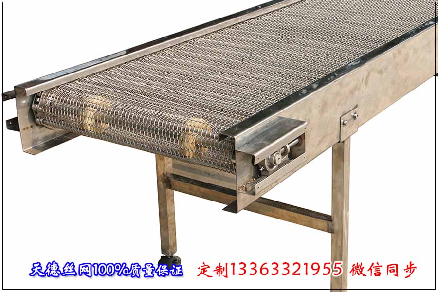 下面是此網(wǎng)帶輸送機的詳細(xì)數(shù)據(jù): 網(wǎng)帶輸送機的凈寬度為600mm(輸送帶的使用面積),輸送機平面的尺寸為1824mm(其余的作為提升),提升的高度為1200mm,總長度為3995mm。機身板厚4.5mm材質(zhì)為碳鋼,所有底腿加橫支撐,鏈輪與傳動軸、軸承座全部為碳鋼。電機使用皮帶輪電機功率為1.5kw,減速機速比1:80, 配帶變頻器。 網(wǎng)帶輸送機使用的鏈條節(jié)距為50.8mm,不銹鋼絲直徑為2mm,網(wǎng)孔為10mm*15mm(凈孔),不銹鋼輸送帶桿直徑10mm,間距101.6mm(兩節(jié)鏈條一根 ),材質(zhì)為耐腐蝕304不銹鋼。 以上是客戶訂購的詳細(xì)數(shù)據(jù),在這里希望我的分享能給大家?guī)韼椭?/span>