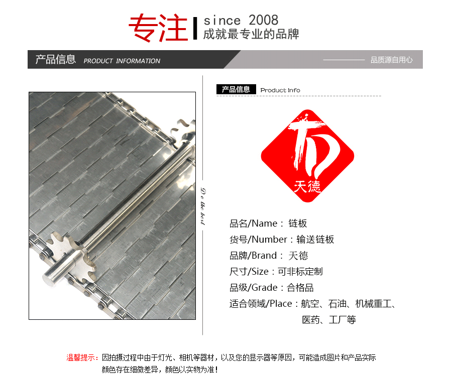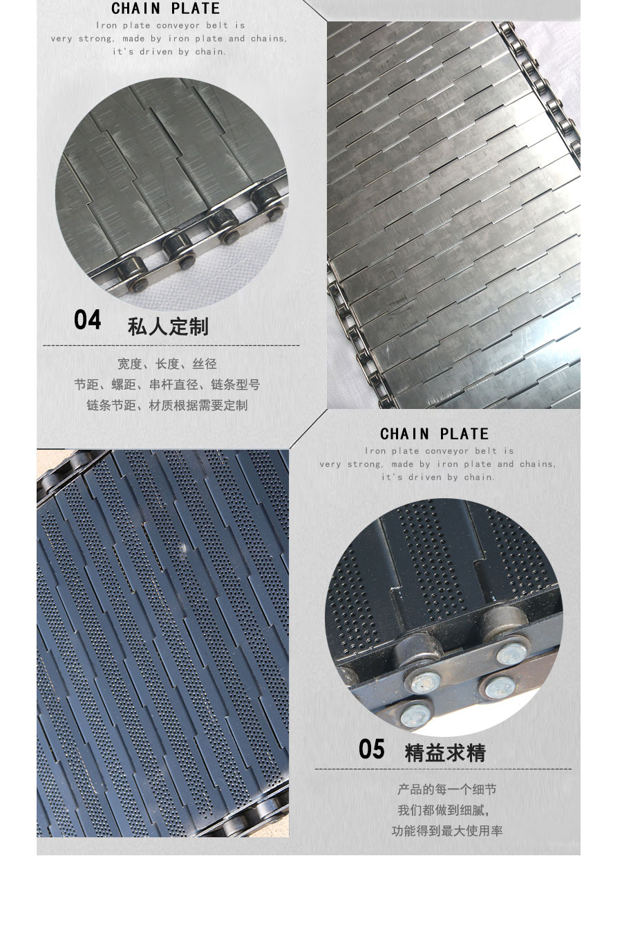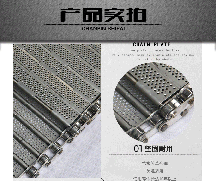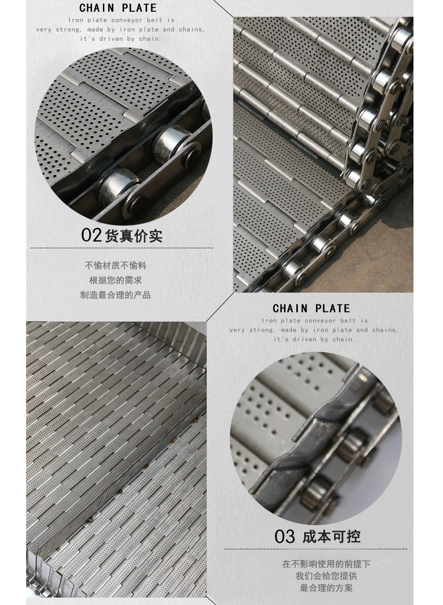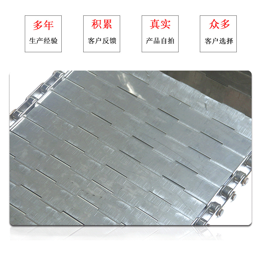 鏈板輸送帶:是采用不銹鋼板沖壓成型,鏈條傳動,每節(jié)由6-10mm支撐桿連接,其運動平穩(wěn)、力量大,適合用于輸送細小的高密度物件,輸送過程中運轉(zhuǎn)平穩(wěn),安裝更換方便,成本高,使用壽命較長。