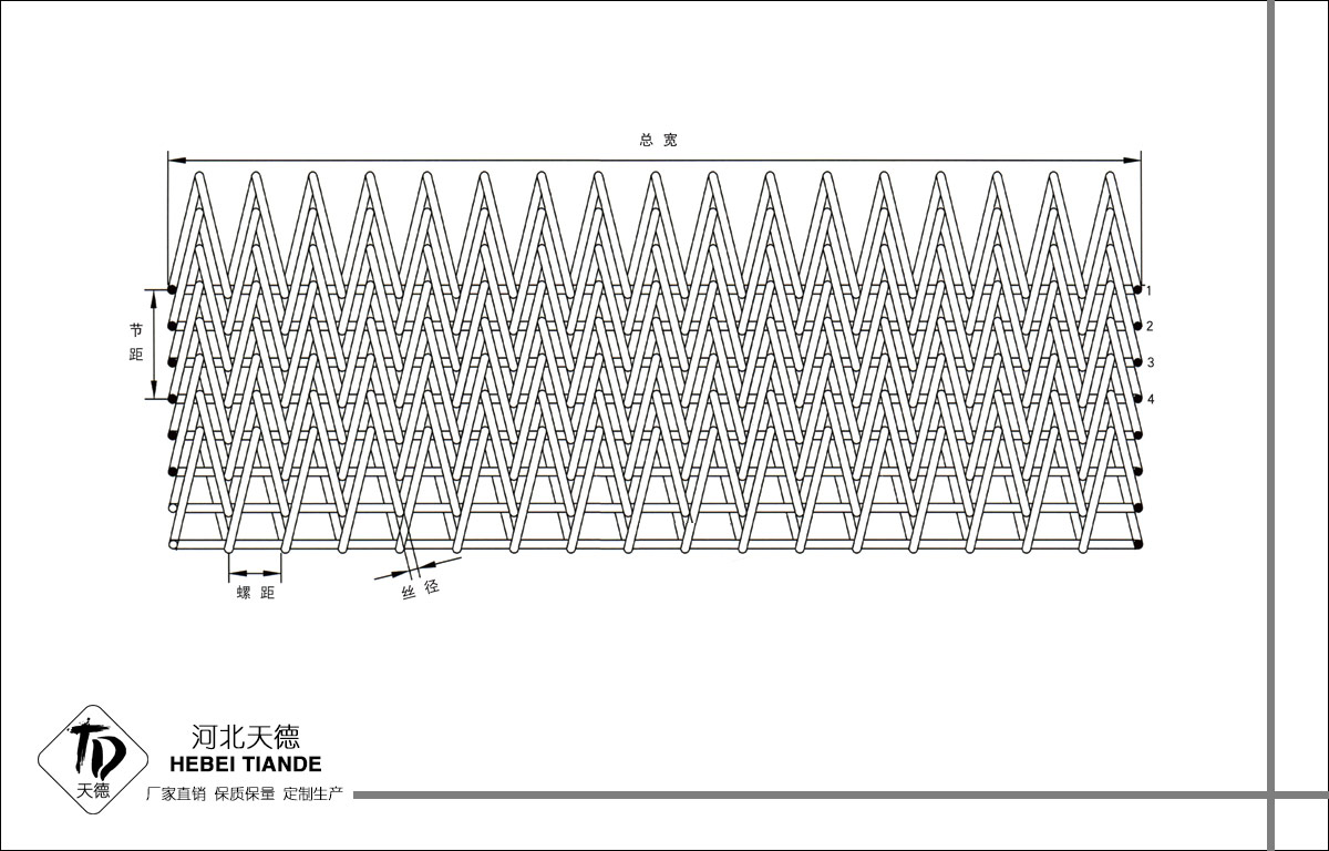 人字形網(wǎng)帶由左右交替的網(wǎng)條通過(guò)四根直串條聯(lián)結(jié)而成,準(zhǔn)確的編織技術(shù)使網(wǎng)帶既具有密度、高網(wǎng)孔、細(xì)運(yùn)行靈活的特點(diǎn),它對(duì)材料和編織技術(shù)要求高。