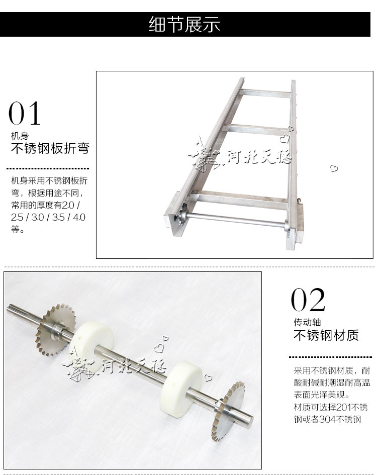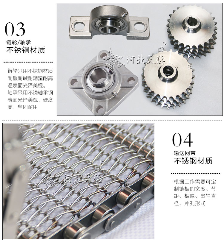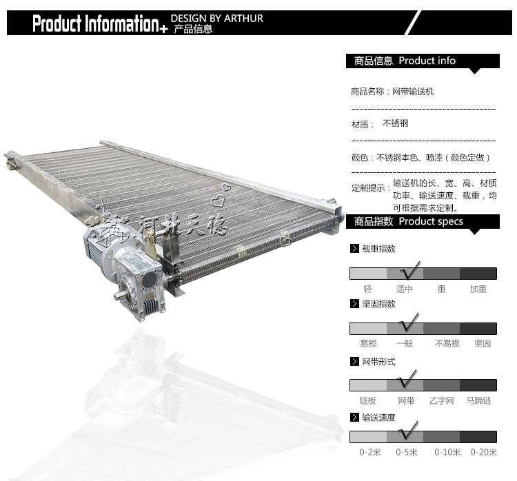 網(wǎng)帶輸送機結(jié)構(gòu)形式: 水平直線輸送、提升爬坡輸送、轉(zhuǎn)彎輸送等多種形式,輸送帶上還可增設提升擋板、側(cè)擋板等附件,能滿足各種工藝要求。輸送機材質(zhì):有A3低碳鋼、201不銹鋼、304不銹鋼等。