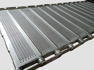 擋板鏈條不銹鋼網帶由左右交替的網條通過直串條聯結而成,網帶網孔較密,網孔間距均勻,能使網帶行走平穩(wěn)。