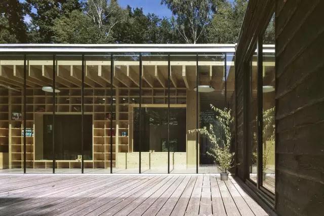 考慮到無柱玻璃立面,屋頂的懸挑邊緣采取直立梁的形式,無邊緣的粗鋸落葉松板形成包層。外表面帶有各種參差不齊的邊緣,與周邊自然相聯系。露臺交替布置,使建筑進一步與周邊蔥翠的環境相融合。