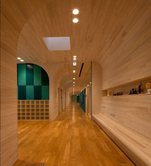 一所位于日本愛知縣張地區的旭城這是給五歲一下的一百多個孩子使用的幼兒園,在過去很多的幼兒園中孩子們的日常活動就像是吃飯玩耍和上廁所或者是睡覺都會是在分開的各個室內進行的,然后設計師的目標是想在一種連續時間狀態下去捕捉孩子的這些活動,并在這個時間容器中布局建筑以及藝術繪品,共同創造出好似一個立體圖畫書般的幼兒園。(幼兒園室內設計)