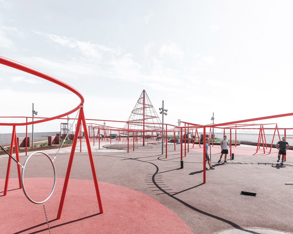 設計師沒有遮掩而是希望以暴力的結(jié)構(gòu)打破立面,樓層的外部掛著一系列的種植槽,和建筑的結(jié)構(gòu)相呼應,在給人們創(chuàng)造適宜的空間的同時也把綠色帶到了每個角落,兩條巨型樓梯穿插其中,樓梯之上采用鋼制扶手防護延綿而上,而轉(zhuǎn)到屋頂之后則是轉(zhuǎn)化為秋千、攀爬架、單杠等等面向各個年齡階層的運動游樂設施,創(chuàng)造出一個活力十足的公共空間。