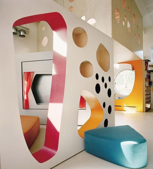 這些洞口可以被開發(fā)成多種用途———書架,抽屜,公仔盒;稍大的洞口還可以允許孩子們窩在里面擁有一個獨立的玩耍空間,為捉迷藏提供了絕好的空間;有的洞口設計了小小的窗簾,限定了空間,成為一個“成人勿入”的地方,也是玩“過家家”的絕佳場所。較高的墻安裝了攀援設施,在保證安全的前提下允許孩子們攀爬;較厚的墻內(nèi)設計了可容納孩子躺臥的微型小床,成為一個很有安全感的小臥室,超小的尺度使得成人只能“偷窺”,無法進入
