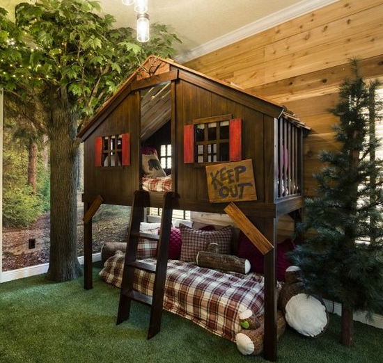 森林風格的設計,一張鋪滿房間的綠色地毯,小木屋的床位設計,下方為休息區,仿佛屋中有屋,滿滿的森林氣息。